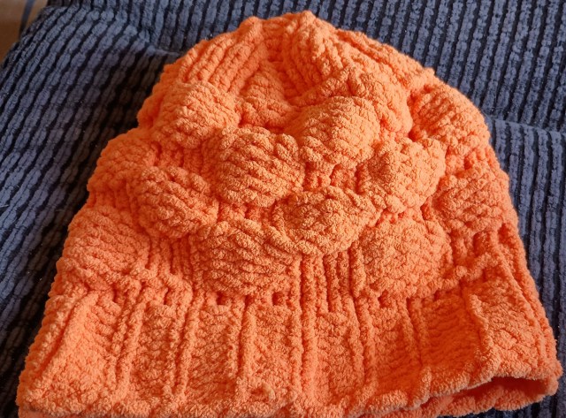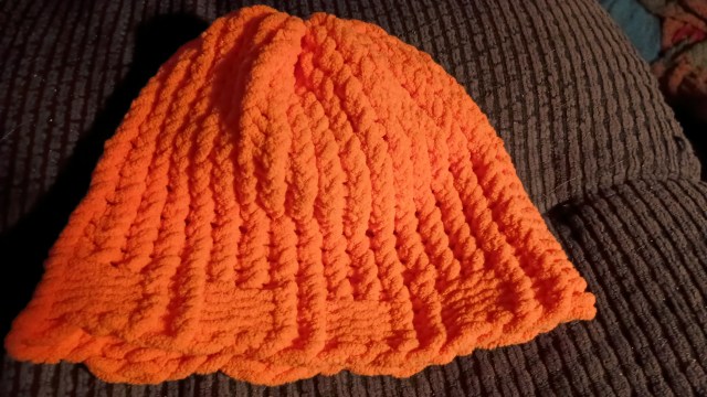 Because crochet has been hurting my thumb, elbow, and shoulder, I went back to loom knitting. The ribbing is two-by-two knit/purl. I am not a fan of e-wrapping. It seems too bulky. But it’ll be warm for someone out there. I’ll make a top-knot puff to finish it.