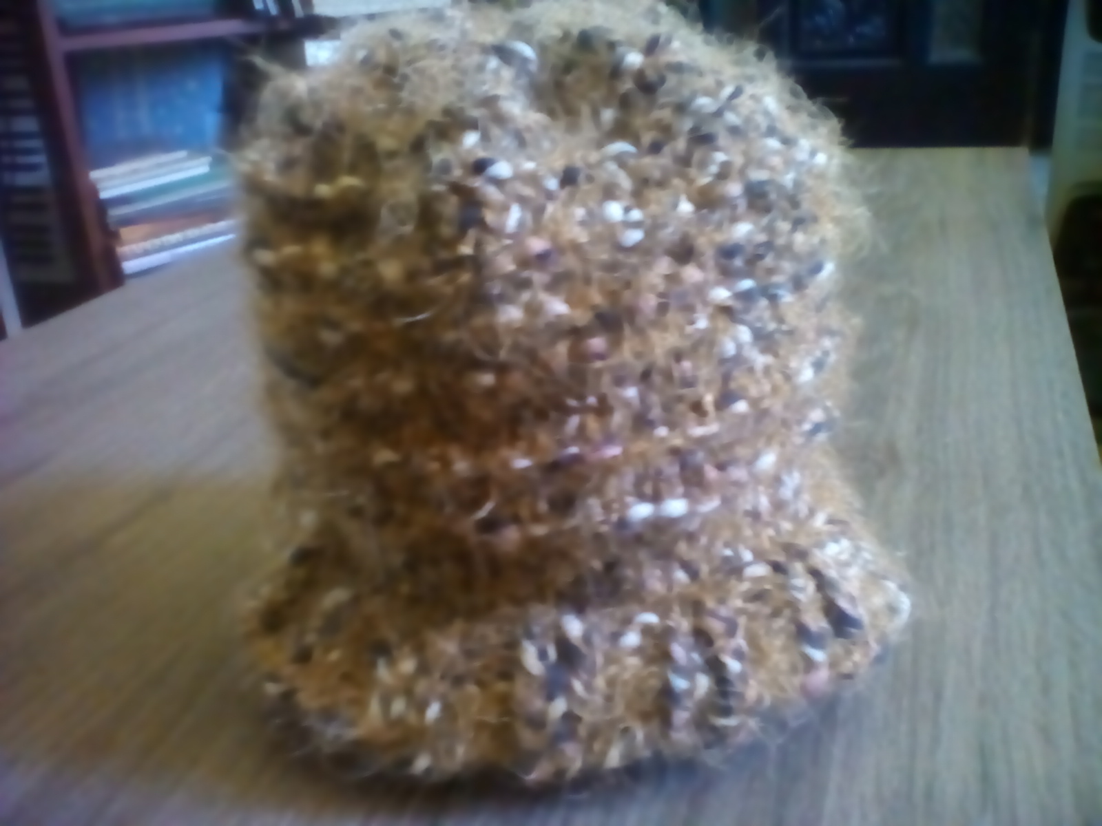 The yarn was a fuzzy mohair type (there was no label on this donated yarn). The loom was the fine gauge small (toddler) KB. The pattern was my own invention. Brim two by two ribbing the rest 1 row flat knit stitch, 1 row U-wrap, 1 row e-wrap, 1 row purl, and then what I hear is called an upper purl where you take the flat working yarn down through the loop on the peg and bring only the resulting loop over the peg leaving the first loop where it was. It gave a bit of a textured stripe. ??? I don’t have a model to put little hats on. This one I used my coffee cup. In this first picture, the brim is down.