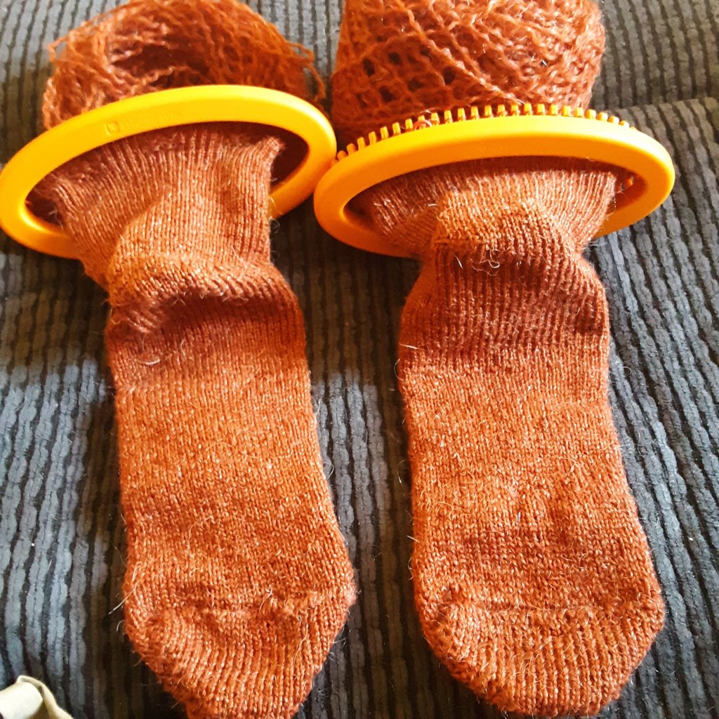 Ear warmers are easy and fun when fine-gauge looms start hurting. Finished the one below and nearly finished with another. I’m making one for me, too. I think they will be great on bad hair days.