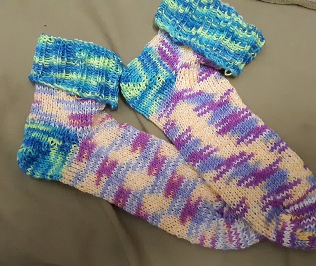 I’m nearly finished with this pair. Because I didn’t have enough of any yarn, I subbed heel and cuff with the green yarn of same type yarn. I’ll probably keep them for me.