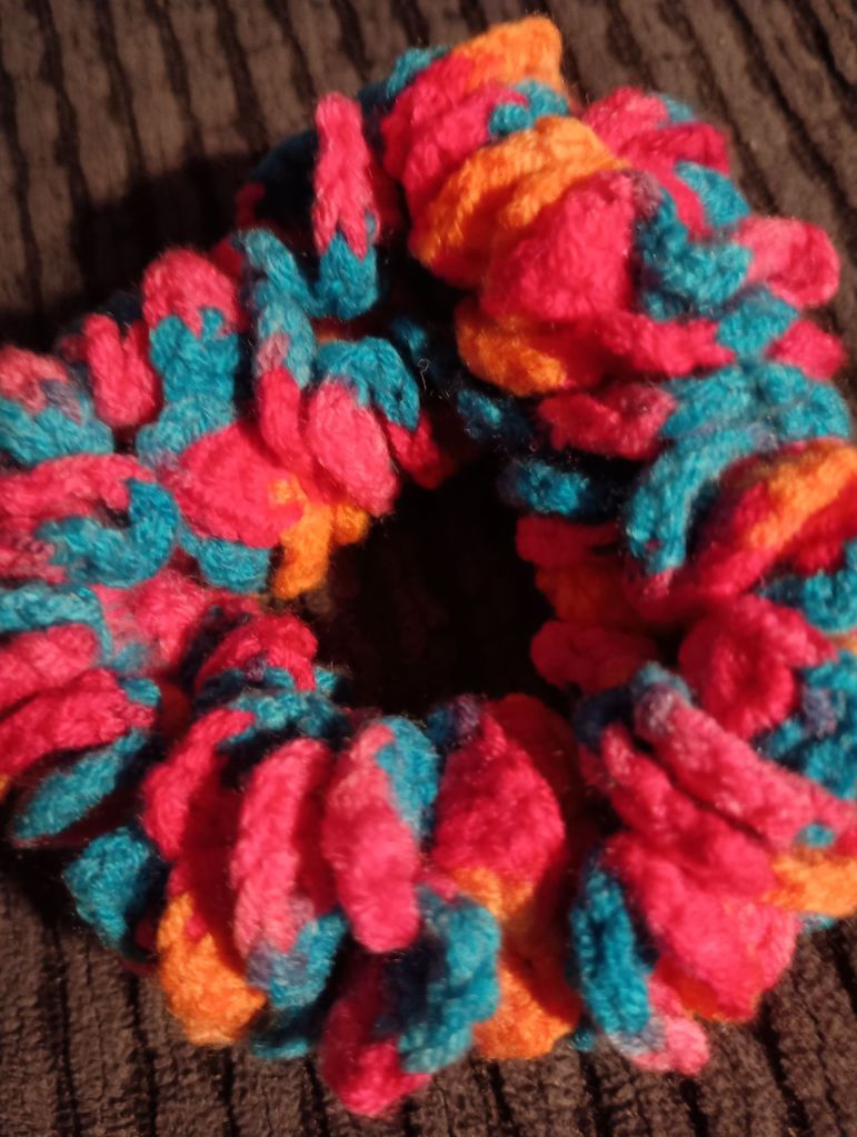 See that wad of yarn vomit? Yeah. That’s how much I had to tink back. I was well into the heel when I noticed a big mistake. Hopefully, I can get back the lost bits soon. Once I start the heel, I pretty much stay with the one pair. See, once the heel is done, there’s only a couple inches of ankle bits. Then I finish each sock on it’s own set of needles. It makes the castoff easier that way.I don’t know if I shared but this ponytail holder finished with the beginning of my case of COVID. These little projects were about all the productivity I got done during the fever parts.
