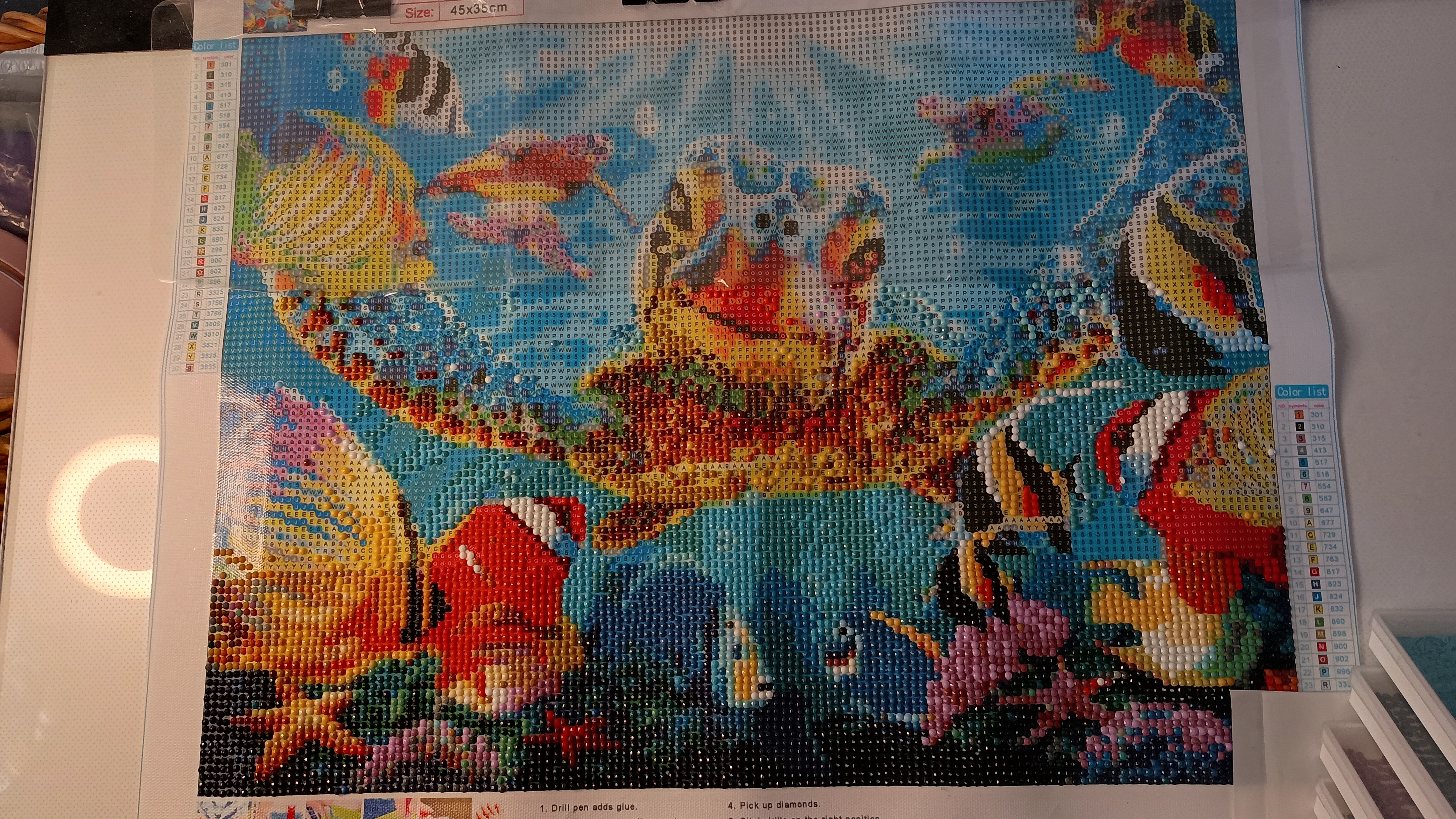 One of my hobbies is diamond painting. My ‘smiling turtle’ is coming along. I’d say about halfway.