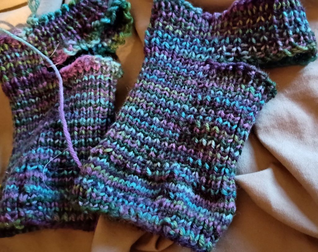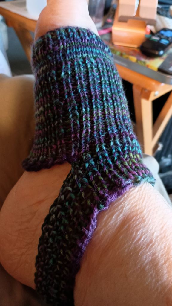 It started with one skein, divided into two for two yoga socks, both finished, lost one, so this is now a One-Liner?