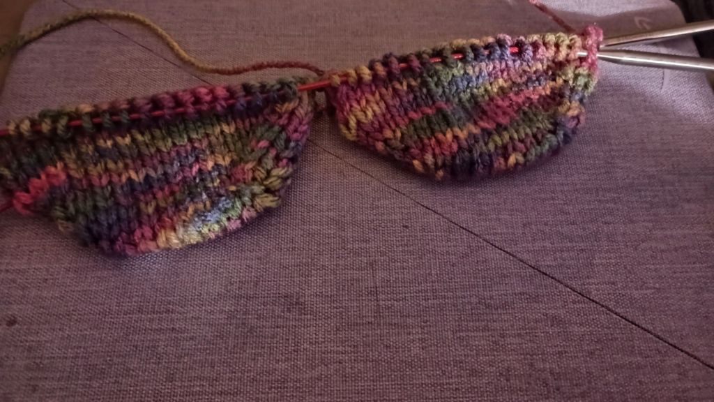 The thing is, there aren’t many YouTubes teaching open-toe cast-on for two at a time, magic loop, long cable needles. In this case Chiaogoo 40″. Still by casting on (long-tail) 1/2 of sock one, drop 1st sock yarn, pick up sock yarn 2. Long tail cast-on first half of sock two. I used a marker between front and back, then cast-on second half of sock two. Slide down sock two. Pinch and pull to divide front and back by magic loop. Now finish casting on second half of first sock.