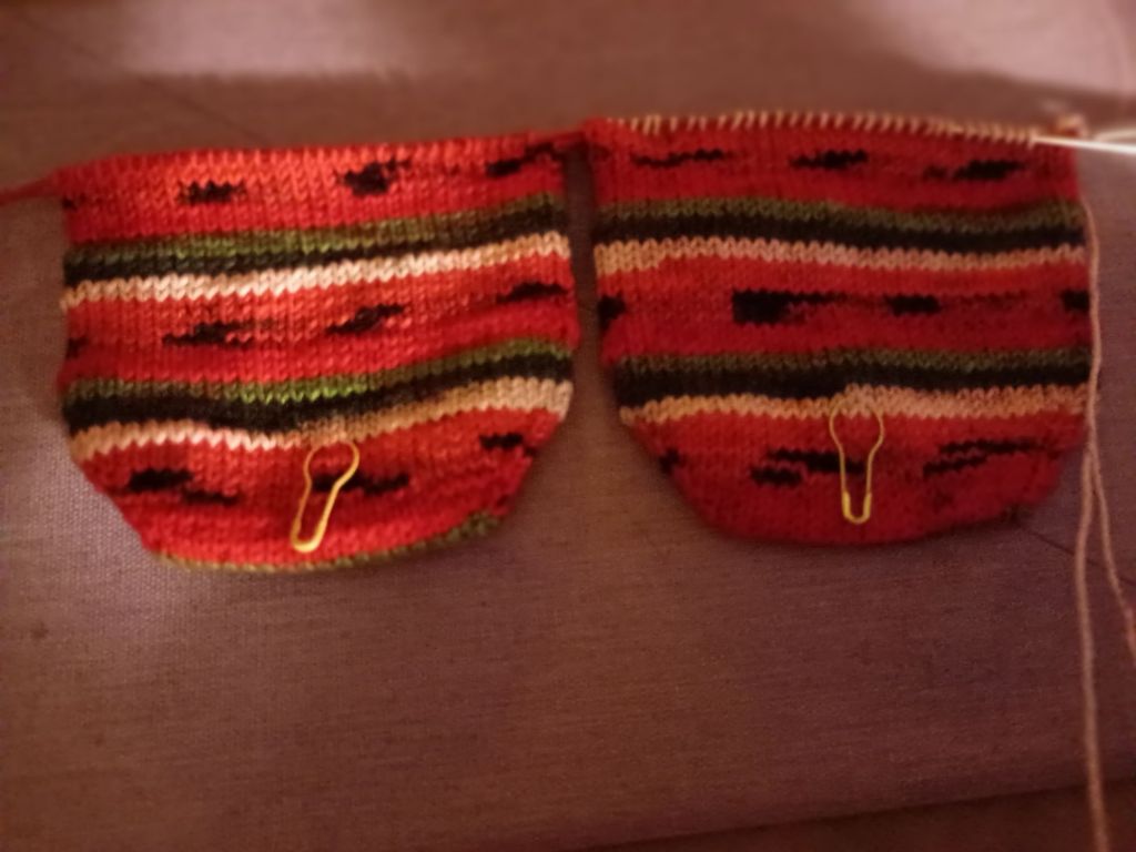 I think I did a row or two here. After frogging back several rows. I’m sharing the cakes with the socks to show the way it looks knitted or wound. I love these colors.