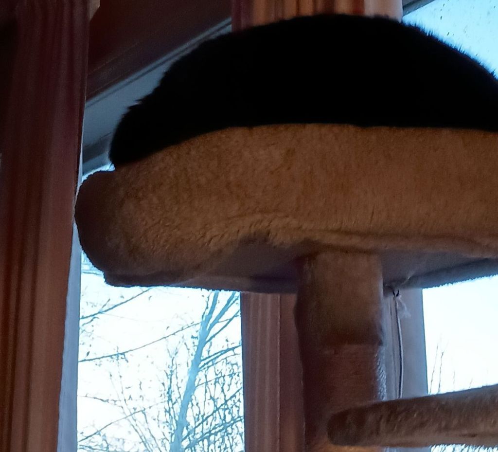 He’s way too big for the kitty tree now but he manages to play in it with Shiloh sleeping on the top nest.
