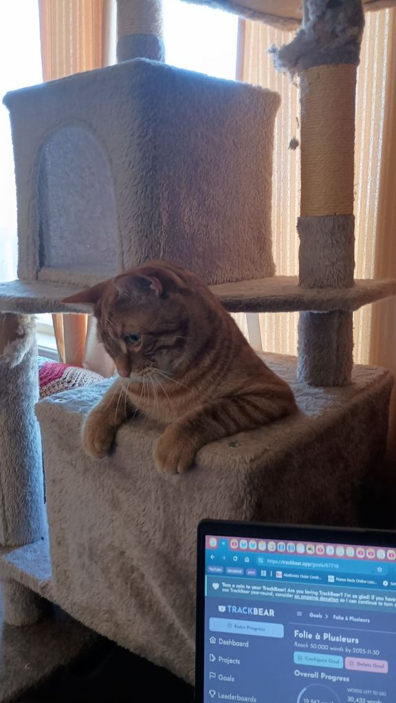 On the other hand, on November 1st, my yWriter app was empty. On November 30th, it should be full. I should be at 36,674 words. I only have 33,172. TrackBear says I should write 1,893 a day to reach the 50k by the end of November. But that is a lot. 1,667 is a lot. If I can push it today and for a few days, I might bring this project to something doable. Wish me luck! I need to bring this story to its full and proper ending. Let’s hope the brain isn’t empty!