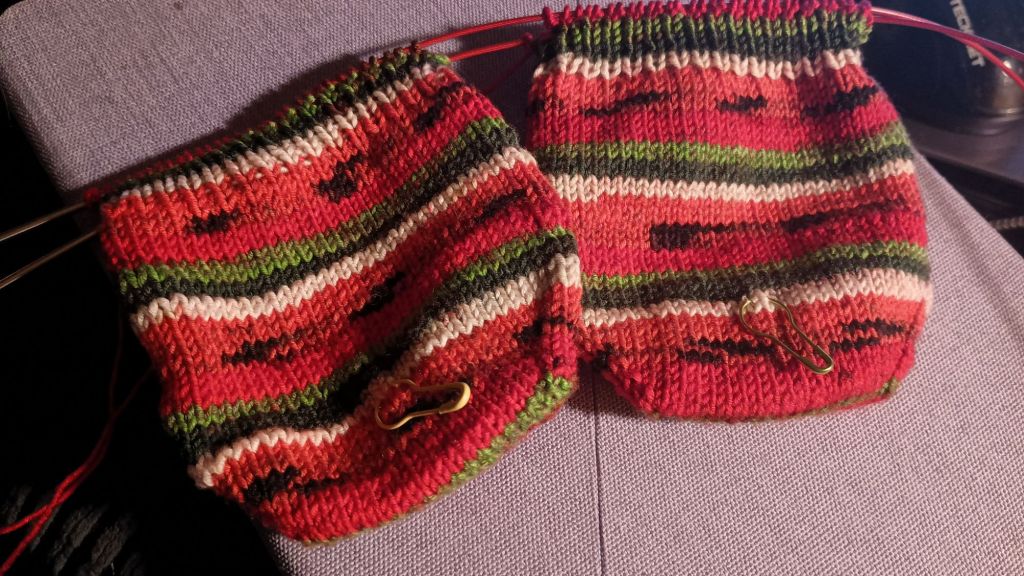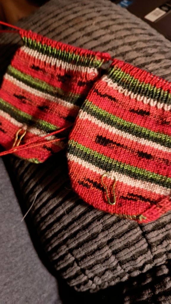 Watermelon socks are coming along. Size 2 40″ Chiaogoo needles TwoAtATime socks. I’m working on the arches now.
