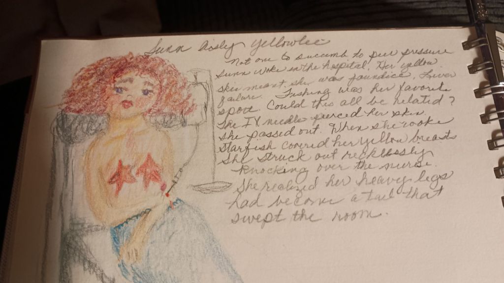 Not one just to succumb to peer pressure, Sunn woke in the hospital, her yellow skin meant that she was jaundice from liver failure. Fishing was her favorite sport–could this all be related? The IV needle pierced her skin. She passed out. When she woke, starfish covered her yellow breasts. She struck out in fear, recklessly knocking over the nurses. She realized her heavy legs had become a tail that swept the room.