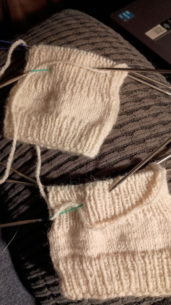 I never quite know what to call these. They are acrylic. Still, the yarn is soft and warm. Thick socks or slipper socks. Size 7 40″ Chiaogoo needles TwoAtATime socks. I need 2 more inches of arch ribbing before the start of the Fleegle Heel.