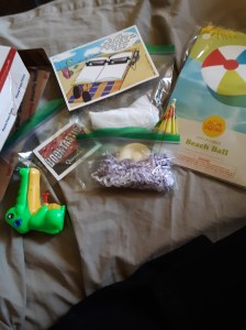An alligator squirt gun, a shell-shaped soap, a Booktastic trivia card, a baggie of wipers, a postcard from the beach, and a beach ball. I immediately blew up the ball.