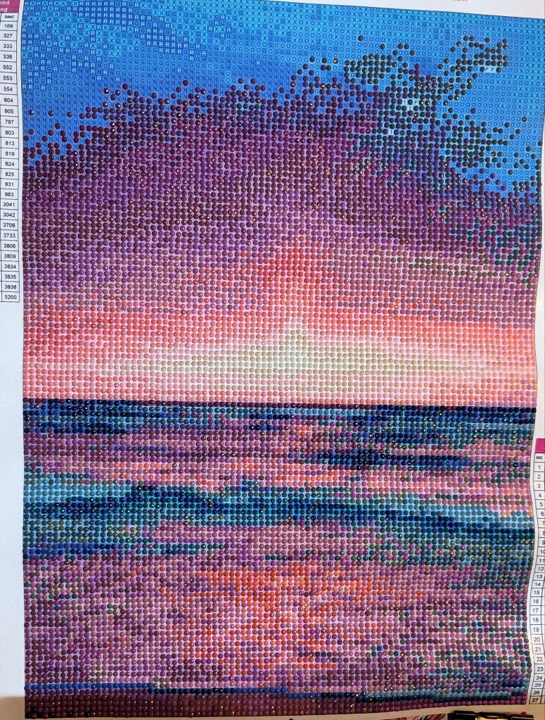 As you can see the sunset beach is nearly finished. Just a bit of sky. All the pinks are done. On to the blues.