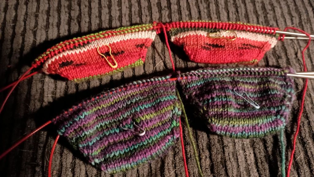 I’ve added several rows on this pair. I don’t know why I favor this pair over the watermelon but I’m nearly to the arch ribbing.