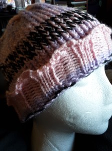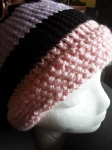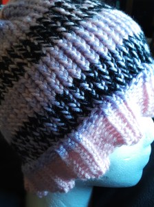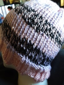 Hat number two with same Caron Simply Soft acrylic yarn. Soft Pink, Orchid, and black. It is a soft yarn. But I don’t think that it is a good sock or slipper yarn as it isn’t very stretchy. Because of that, I chose to use the e-wrap knit stitch. The brim was a garter stitch which is one row of knit, one row of purl. The rest just the e-wrap mentioned before. I made this one the same KB white loom, 72 pegs, fine-gauge that I used for the hat just before this one. I’ve started another with the black yarn hoping to make a hat for a little boy. I hope I can finish by tomorrow.