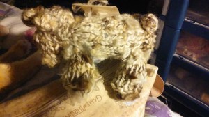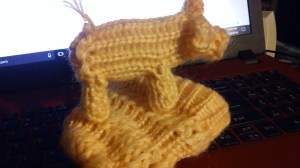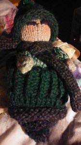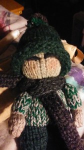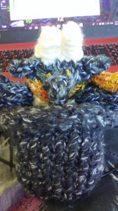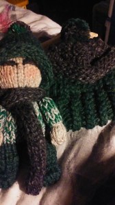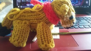 This lion was fun to make but the mane is hard for me. I count to nine without knitting fairly well. Keeping track of nine rows of two seems impossible. So some lanks of mane came out too long. I just took some ribbons and tied them fancy like the Cowardly Lion in Emerald City. Notice the pink arm. I ran out of the yarn I used on the rest of the lion as I reached the last arm. Since these go to kids in the clinic I figured I’d give him a cast. Hopefully, this guy will find a kid with a cast to commiserate with.