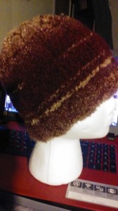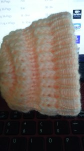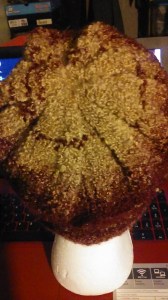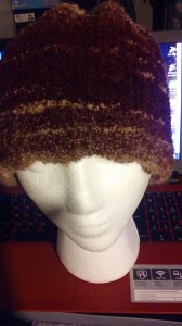 I really enjoyed making this hat and love how it turned out. It was made on KB white loom with the small gauge. I just did three knits and three purls (rib stitch) all the way to the top. Because of the small gauge, it took quite a while to finish. The yarn is bumpily but very soft. It has that gradual color change that works up so cool. I have a ton of this that I took from Hat Huggers because it is so soft. So I am making another one with smaller rib stitch pattern. I think this will make a good hat for someone who might have bad/no hair days. It’s so soft and fits low on the head. I have to admit I am tempted to keep it. I won’t. But I can wish.
