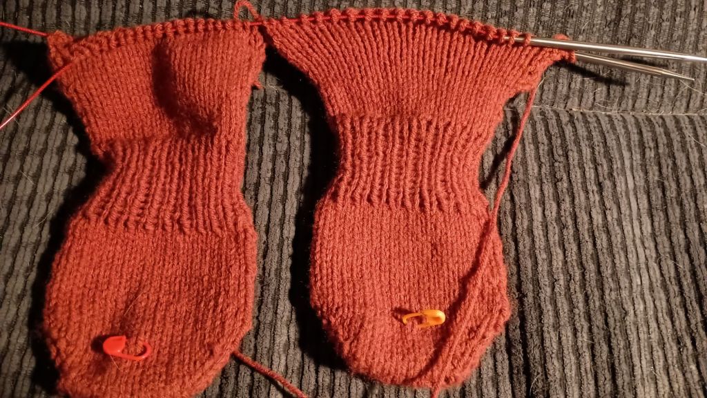 Maybe two more knitted rows and I’ll begin the heels. I have to do the heels in one day so I don’t get lost. So maybe in spite of arthritis these will be done by my brother’s birthday.