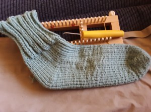 I didn’t have a finished product yesterday for Finished Friday. I had one slipper sock done, and while chatting with my friends, I nearly finished the other. Boom! Done today!