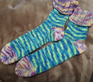 KB fine-gauge Flexee 20 links. Tie-up starting with Kitchener cast-on. German short-row heel. Cuff two-by-two purl/knit. Stretchy cast-off. Now passed on to charity.