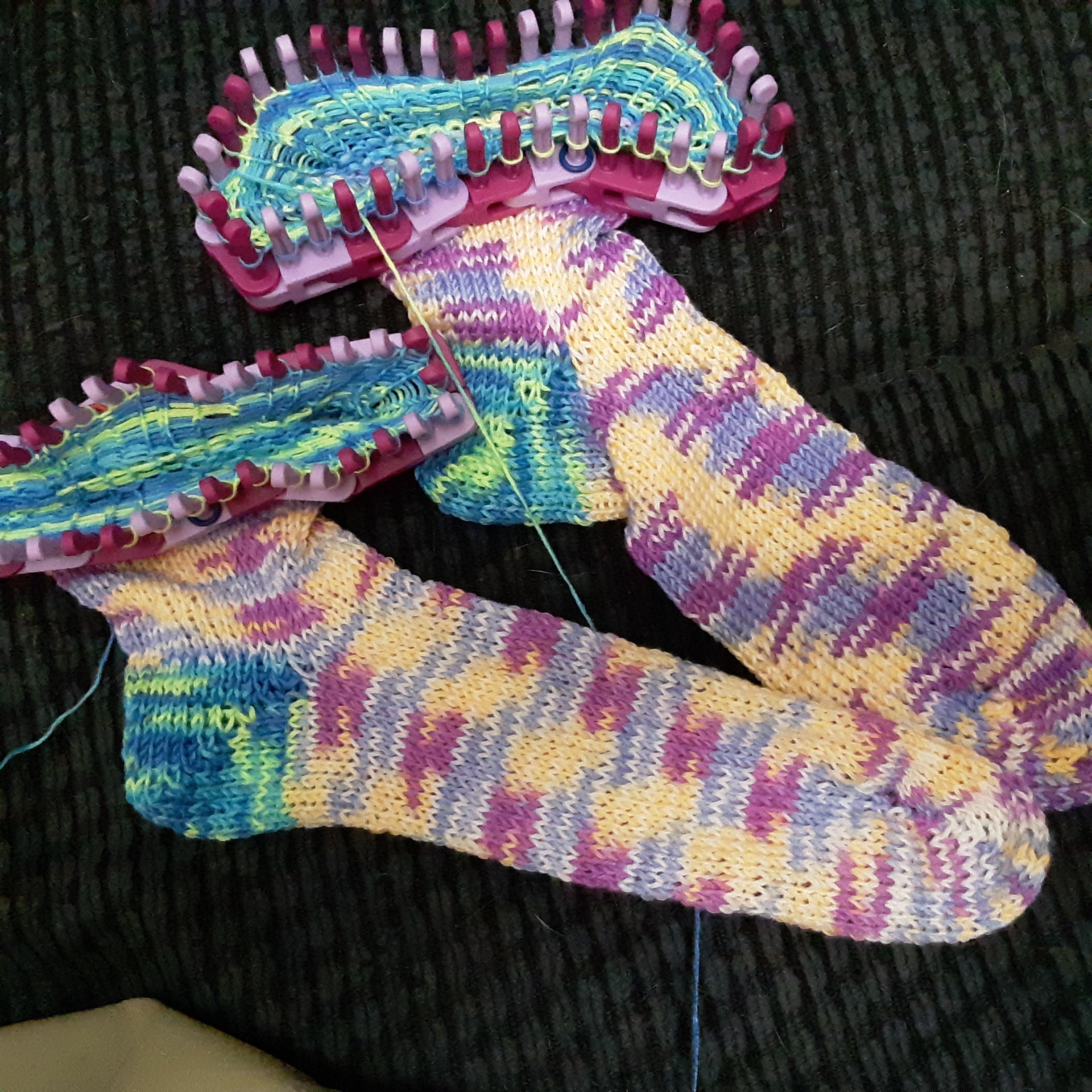 The bluish tinted yarn is very soft. That’s the part on the body of the sock. The toe and heel are a sturdier yarn. Because there are fewer stitches to keep track of, this is a better project when I am distractible. I finished the first heel today so these are going faster than the first pair.