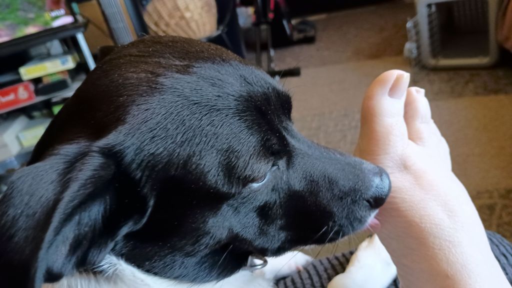 More like kiss my foot. We love each other. I don’t lick his feet. Blech! But–Doggy kisses!❤️