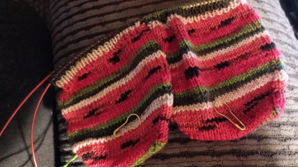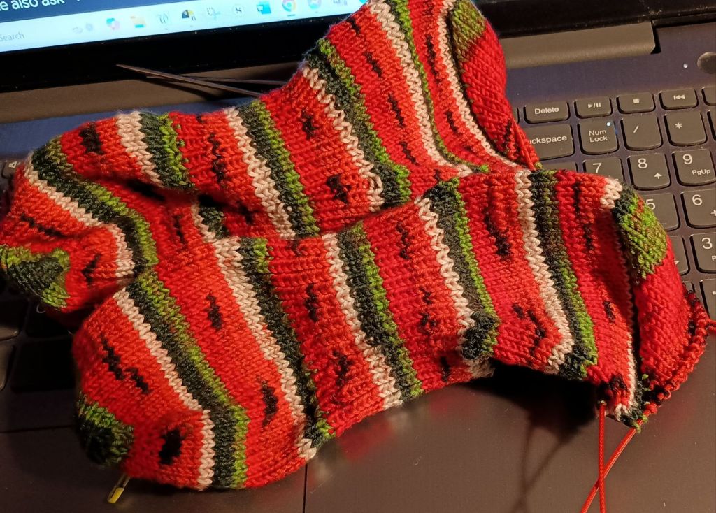 Finally finished with the heels’ decreases. In about three inches the socks will fly in the mail.