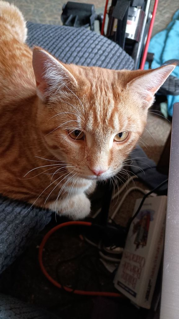 He, finally, jumps into my chair seeking pets and love. He tolerates lap time. He’s very food oriented. A little treat gained the pets. Bigger reward, lap time. He’ll roll the ball back to me and gives high fives. (Oh, that book is my character development fav. And yes, my stationary bike is right in the way to force me to hop on and go!